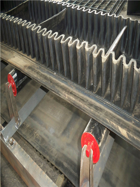 擋邊帶式輸送機其結構是在平行橡膠運輸帶兩側黏上可自由伸縮的橡膠波形式的裙邊,在裙邊之間又粘有一定強度和彈性的橫隔板組成匣型斗,使物料在斗中進行連續(xù)輸送。擋邊帶式輸送機可廣泛用于煤炭、糧食、建材、化工、水電、和冶金等部門,在環(huán)境濕度為19°-+40°范圍內,輸送堆積比重為0.5-2.5t/m3的各種散裝物料。對于輸送有特殊要求的,如:高溫、酸、堿、油類物質或有機溶劑等成分物料,采用特殊的擋邊輸送帶。