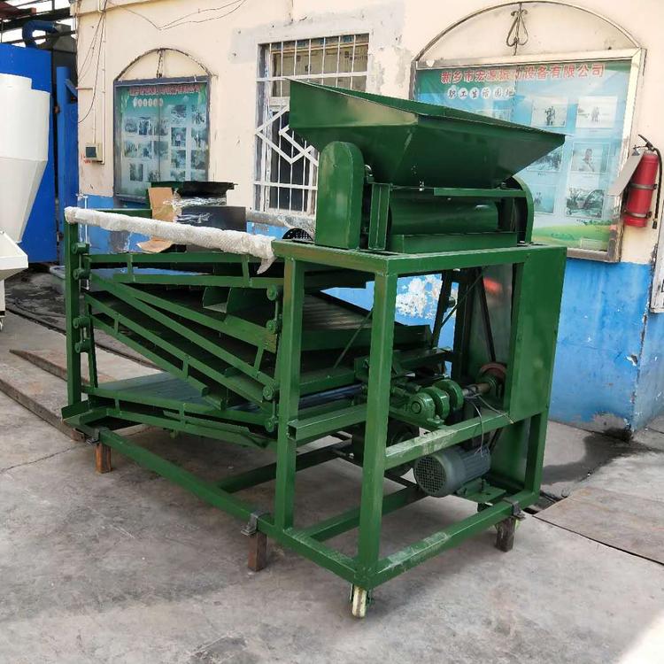 將花椒放入進(jìn)料口---------進(jìn)料口下方有一個(gè)分離器將花椒耙籽殼分離開(kāi)--------分離的混合物料落入回旋篩--------回旋篩分為3層-------一層出料霉花椒、花椒葉、花椒枝-----一層復(fù)式篩網(wǎng)篩的是花椒枝----------二層為花椒枝出料口-------復(fù)式篩網(wǎng)為花椒籽出料口--------花椒籽出來(lái)時(shí)有風(fēng)機(jī)可以增加花椒籽的凈度。提高花椒凈度---------底層出來(lái)的是花椒殼