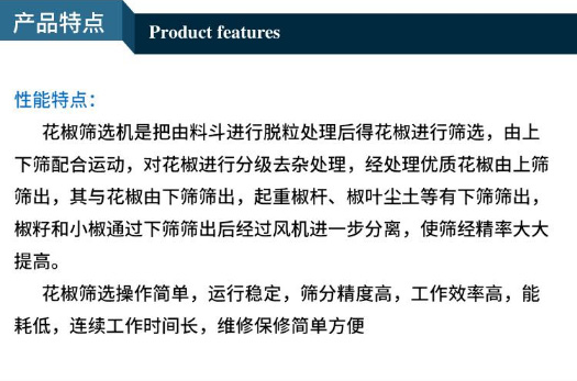 花椒清選篩也稱為花椒篩選機、花椒篩分機等,其功能就是把烘干后的花椒粉碎、脫粒、篩選,把花椒的枝葉、殼、籽等分別篩選出來,花椒殼屬于成品作為調(diào)味品售賣,走進我們千家萬戶,椒籽則用來榨油,各有各的用途,花椒也是入藥的藥材,一顆小小的花椒發(fā)揮出了很大的自身價值。